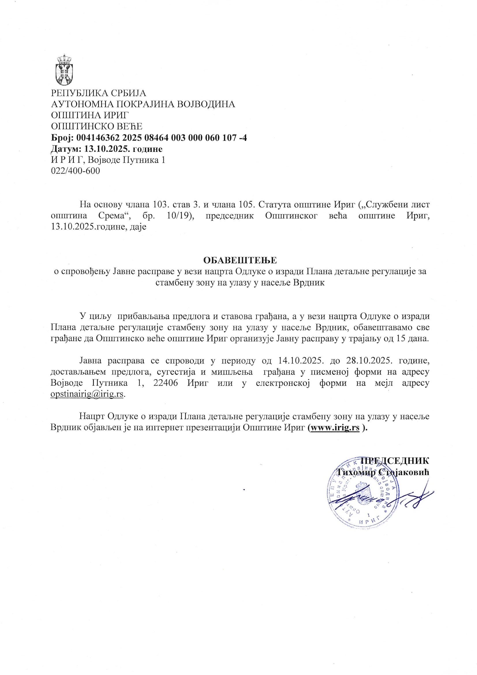 Обавештење о спровођењу јавне расправе ПДР стамбена зона на улазу у насеље Врдник